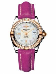 Building on its resolutely technical vocation, Breitling distinguishes itself by its original interpretation of the feminine vision of time. For the brand with the winged B, a ladies’ watch must combine performance and elegance, reliability and refinement. The Galactic 32 is a prime example. This feminine and yet sporty timepiece expresses the ultimate in luxury, embodied in its exquisitely crafted dial. As with many Breitling watches, the Galactic 32 is available in a wide variety of metals, dial colors and types of straps and bracelets. Powering this watch is the quartz caliber 71.Reference C71356LA|A712 features a stainless steel & rose gold case with diamond-set bezel and a mother-of-pearl dial with diamond-set hour markers.