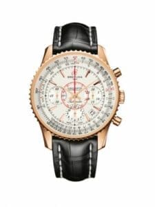 Endowed with a look inspired by early Chronomat’s of the 1940s and 1950s and featuring the famous aviation slide rule, the Montbrillant 01 chronograph was named after the building on Ruelle Montbrillant in La Chaux-de-Fonds which housed the Breitling workshops from 1892 to 1979. It is equipped with the high-performance Manufacture Breitling Caliber 01. This successful association of tradition and innovation is enhanced by a dial bearing numerals or hour-markers and hollowed counters. The caseback is adorned with an embossed medallion depicting the historical Montbrillant building.Reference RB013012.G710 has a red gold case and a Mercury Silver dial with applied stick markers.