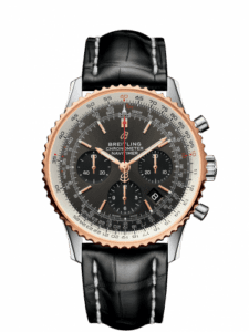 The Breitling Navitimer 1 B01 UB0121211F1P1 was introduced in 2018 as part of the complete revamp of the Breitling collection, as witnessed by the simplified B logo at 12:00. This version has a stainless steel case with red gold bezel, and a Stratos grey dial; it is fitted with a crocodile leather strap.
