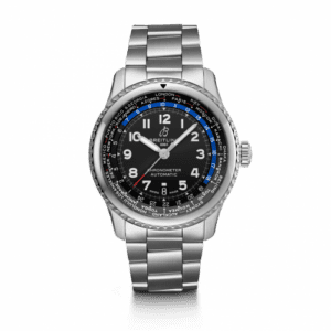 The Breitling Navitimer 8 Unitime was introduced in 2018. It is part of the Navitimer 8 collection, which is inspired by cockpit instruments and pilot’s watches made by the brand’s Huit Aviation Department.The Breitling Navitimer 8 Unitime AB3521U4.BG85.189A has a stainless steel case and a black dial. It is fitted with a stainless steel bracelet. Note; the second picture is of a pre-production model.