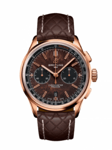 The Breitling Premier was introduced in late 2018 as a brand-new family, Based on the Premier of days gone by, this collection consists of classically-styled watches with pair vintage-inspired looks with modern detailing and technology.The Breitling Premier B01 Chronograph 42 Bentley Centenary RB01181A1Q1X1 celebrates Bentley’s 100th anniversary. It is powered by the brand’s in-house caliber B01. It features a red gold case with alternating brushed and polished surfaces. The dial is made of wood – inspired by the dashboards of Bentley cars. This watch is fitted with a special leather strap with pin buckle.
