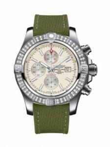 The Super Avenger II reflects the full force and personality of the Breitling brand. This genuine thoroughbred is distinguished by its oversized case with a diameter of 48 millimeters. The generous size of its dial and hands ensures optimal read-off of both the time and the measured times; the non-slip crown and pushers are extremely easy to handle, while with this particular version, the diamond-set bezel adds a touch of glamour Like the other models in this range, it provides a well above-average of water resistance, since it is designed to withstand a pressure of 30 bars, or the equivalent of 300 meters (1.000 ft). To power this chronograph, Breitling has chosen a mechanism well up to the task in the shape of the sturdy Caliber 13, the most tried and tested of all movements used by Breitling.