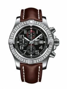 The Super Avenger II reflects the full force and personality of the Breitling brand. This genuine thoroughbred is distinguished by its oversized case with a diameter of 48 millimeters. The generous size of its dial and hands ensures optimal read-off of both the time and the measured times; the non-slip crown and pushers are extremely easy to handle, while with this particular version, the diamond-set bezel adds a touch of glamour Like the other models in this range, it provides a well above-average of water resistance, since it is designed to withstand a pressure of 30 bars, or the equivalent of 300 meters (1.000 ft). To power this chronograph, Breitling has chosen a mechanism well up to the task in the shape of the sturdy Caliber 13, the most tried and tested of all movements used by Breitling.