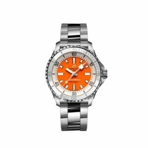 The Breitling SuperOcean Automatic A17377211O1A1 debuted in 2022 as part of a renewed SuperOcean collection inspired by the ‘Slow Motion’ of the 1960’s. This version has a case of 36.00mm with a ceramic bezel insert, and a Orange dial. The movement within is Breitling’s trusted caliber B17 ND.