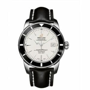 The Breitling Superocean Heritage echoes the functional and elegant design of the 1950s original. The black, blue or green unidirectional rotating bezel matches the various dial colors; a red gold ring is also available. In its present configuration the case measures 42mm across. The Superocean Heritage is available on a variety of straps.