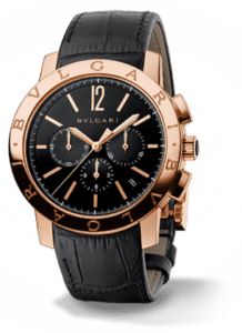 The Bvlgari Bvlgari Velocissimo features a round case with the distinct and iconic ‘Bvlgari Bvlgari’ bezel. It is powered by an automatich chronograph movement with date that beats at a fast-paced 36.000 bph. In this version the pink gold case is fitted with an integrated alligator strap.