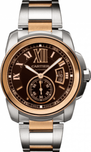 The Calibre de Cartier was introduced in 2010. It was the first mass-production Cartier powered by an in-house movement, something previously only found in a handful of high-end watches by the Parisian brand. The round case is bold and modern, while the traditional sword-shaped hands and Roman numerals add a touch of the iconic Cartier flair. A bracelet option was added to the collection in 2011, while 2012 saw the introduction of the chronograph. A smaller 38mm version was introduced in 2015.Reference W7100050 has a stainless steel case with pink gold bezel and a chcolate dial. It is fitted with stainless steel / pink gold bracelet