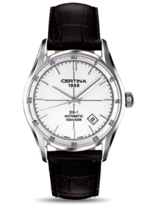 This Certina Gent Automatic Collection DS-1, ref. C006.407.16.031.00, has a stainless steel case and a leather strap. The watch has a silver dial with a date window between 4 and 5 o’clock.Reference: C006.407.16.031.00