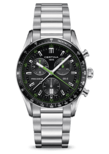 This Certina Gent Quartz Collection DS 2 Chrono 1/100 Sec, ref. C024.447.11.051.02, has a steel case and a stainless steel bracelet. The watch has a black dial with green accents and a date display at 6 o’clock. Reference: C024.447.11.051.02