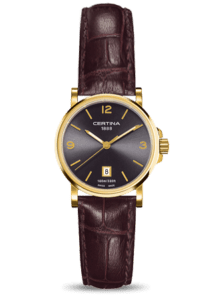 This Certina Lady Quartz Collection DS Caimano Lady, ref. C017.210.36.087.00, has a stainless steel case and a brown leather strap. The case has a yellow gold pvd coating. The watch has a grey dial with arabic numerals and a date display at 6 o’clock. Reference: C017.210.36.087.00