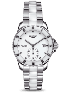 This Certina Lady Quartz Collection DS First Ceramic, ref. C014.235.11.011.01, has a stainless steel case and a ceramic bezel inlay. The stainless steel bracelet has ceramic center links. This watch has a white dial with small seconds and a date display at 3 o’clock. Reference: C014.235.11.011.01