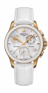 The Certina DS First C030.250.36.106.00 has a case of 38.00mm, which is crowned by a fixed bezel with ceramic insert. This watch is powered by caliber G10.962 BH, a quartz movement with chronograph, date, and moon phase. The dial is Silver.