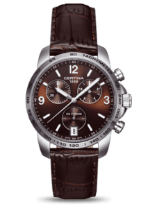 This Certina Gent Quartz Collection DS Podium Chrono, ref. C001.417.16.297.00, has a steel case and a brown leather strap. The watch has a brown dial and a date display at 6 o’clock. Reference: C001.417.16.297.00