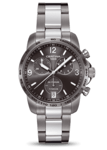 This Certina Gent Quartz Collection DS Podium Chrono, ref. C001.417.44.087.00, has a titanium case and bracelet. The watch has a grey dial and a date display at 6 o’clock. Reference: C001.417.44.087.00