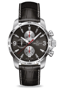 This Certina Gent Automatic Collection DS Podium Chronograph, ref. C001.427.16.297.00, has a stainless steel case and a leather strap. The watch has a anthracite dial with subdials at 6, 9 and 12 o’clock. A date window is found at 6 o’clock.Reference: C001.427.16.297.00