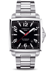 This Certina Gent Automatic Collection DS Podium Square, ref. C001.507.11.057.00, has a stainless steel case and bracelet. The watch has a black dial with a date window between 4 and 5 o’clock.Reference: C001.507.11.057.00