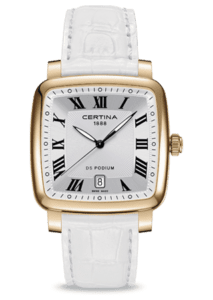 This Certina Gent Quartz Collection DS Podium Square, ref. C025.510.16.083.00, has a red gold PVD stainless steel case and a leather strap. The watch has a white dial with roman numerals and a date display at 6 o’clock. Reference: C025.510.16.083.00