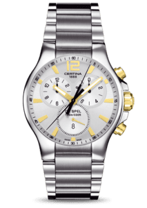 This Certina Gent Quartz Collection DS Spel Chronograph, ref. C012.417.21.037.00, has a steel case and a steel strap. The watch has a silver dial and a date display at 6 o’clock. The crown and pushers are pvd coated in yellow gold.Reference: C012.417.21.037.00