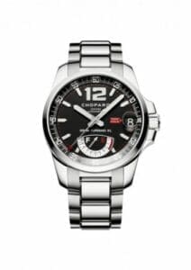 The Mille Miglia GT XL Power Control watch in stainless steel teamed with a stainless-steel bracelet displays a remarkable blend of symmetry and simplicity. Opposite the oversized white 12 numeral on the black dial, a power reserve indicator designed like a petrol gauge on a vintage car dashboard is a stylish nod to automotive design. This watch’s precision is guaranteed by the chronometer certification.