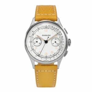 The Excelsior Park Chronograph reference EP95002-YE was introduced in 2021. This watch is based on a 1950’s original by the resurrected brand. The Stainless Steel case measures 38.90mm. Power comes from Sellita’s caliber SW510 BH b, a hand-wound movement with chronograph. The dial is White.This watch is delivered with both a solid as well as a see-through back. The listed height is with the see-through back fitted.