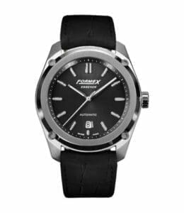 With the Essence, Formex aimes to combine elegance and robustness in a Swiss mechanical high precision timepiece. The stainless steel case features the patented Case Suspension System. Waterproof to 100 meters and finished by hand, it holds the self-winding ETA 2824-2.Ref. 0330.1.7321.322 has a black dial. It comes on an croco-print calf leather strap with a carbon fiber composite folding clasp with patented Micro-Adjustment System.