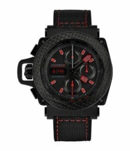 The Formex Motorsport Automatic Chronograph is a chronograph watch inspired by the fast-paced world of motorsports. Ref. 3100.9.8299.216 has a PVD-coated stainless steel case fitted with the brand’s patented suspension system. The bezel is made of carbon fiber. The self-winding movement, caliber 7750, is housed in a titanium container.