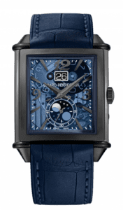 The Girard-Perregaux reference 25882-21-423-BB4A has a titanium rectangular case of 36,1 x 35,25mm and a skeleton dial. It is fitted on a navy alligator strap with folding-clasp.