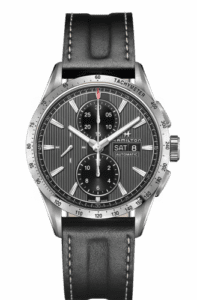 The Broadway Auto Chronograph is urban and sporty. The robust 43mm case has a grey dial with verticle stripe detailing and a polished steel index. The watch features a tachymeter scale and chronograph functions. The automatic movement is waterproofed to 100 meters. The watch is available on either a black leather strap or three-row stainless steel bracelet.REFERENCE: H43516731CALIBER: H-21STRAP REFERENCE: H600.435.100