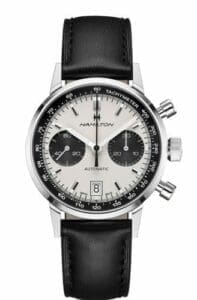The Hamilton Intra-Matic Auto Chrono is a watch inspired by a Hamilton chronograph from 1968. In this modern iteration the case measures 40mm across, whilst holding a self-winding movement with chronograph in the form of caliber H-31. Ref. H38416711 has a silver dial with black counters and a black tachymeter scale. Introduced in 2018, it is 2mm smaller in diameter than the limited edition H38716731 that preceded it.
