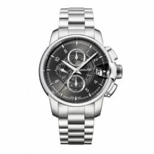 The Hamilton Railroad Auto Chrono is a contemporary watch that takes cues from Hamilton’s rich past in supplying watches to the railways. It features a stainless steel case of 46mm, that houses the automatic caliber A07.211 from ETA’s Valgranges range. The dial features a spiralling tachymeter scale and time is indicated through a set of dauphine(-like?) hands. A notable feature is the cyclops that seems integrated in the case.