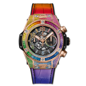 The Hublot Big Bang Unico was introduced in 2013 as the next step in the evolution of the Big Bang – and Hublot. This Big Bang is driven by a ‘Unico’ movement, a self-winding caliber with chronograph and date that boasts a couple of clever solutions.Reference 411.OX.9910.LR.0999 was introduced in 2019. It finds it’s red gold ‘King Gold’ case set with 176 rubies, pink sapphires, amethysts, blue sapphires, blue topazes, tsavorites, yellow sapphires and orange sapphires. The bezel is set with an additional baguette-cut gemstones, while 212 more are found on the dial.