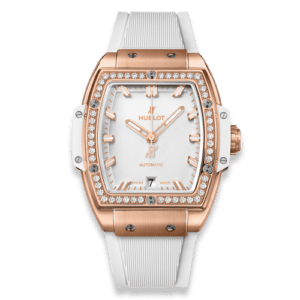 The Hublot Spirit of Big Bang 39 was introduced in 2019 as a more feminine take on Hublot’s Spirit of Big Bang model. At 39mm the case is quite a bit smaller compared to the original model. It houses a self-winding movement with central seconds and date.Reference 665.OE.2080.RW.1204 has a red gold case. Both dial and strap are white.