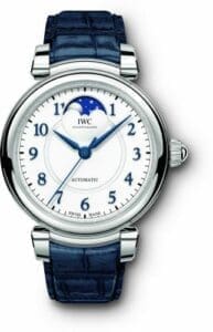 The IWC Da Vinci 36 Moonphase IW4593 was launched in late 2016 in anticipation of SIHH 2017. It marks a return of the style of the original 1985 Da Vinci Perpetual 3570, with a stepped round case and movable lugs. The IW4539 has a case of 36mm, which houses the self-winding caliber 35800 with moonphase indicator. With reference IW459306 the stainless steel case is paired with a blue alligator strap by Santoni. The silvered dial is highlighted by contrasting blue numerals and hands.