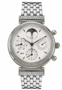 The Da Vinci Perpetual Calendar reference IW9253-10 has a diamond-set White Gold case and a diamond-paved dial with ruby hour markers.IWC introduced its perpetual calendar mechanism for wristwatches in 1985 in the Da Vinci reference 3570. It was a spectacular novelty at the time. Critically acclaimed and powered by its price that shook the industry, the module would grow out to be the most widely sold perpetual calendar mechanism – not only fitted to the Da Vinci collection, but in adapted form in IWC watches such as the Novecento, the GST, the Pilot’s Chronograph and also various models by JLC, including the Master Ultra Thin Perpetual. It would also serve as the base for the IWC’s Grande Complication and their masterpiece of the time, the spectacular Destriero Scafusia.The Da Vinci Perpetual 3750 has a case of 39 * 14.3mm, with hinged lugs. It was available in various metals and with a choice of dial colors, each of which in turn was made with markings in German, Italian, English and French (not always properly reflected in our pictures). Plexi glass was the default option, though at request the watch could be fitted with a sapphire crystal. From 1987 on it was available with a ceramic case in the form of the 3755 (with a sapphire crystal per default), whilst models with gem-set cases carry the reference 8153. A bracelet option was offered in the form of the reference 9252, or 9253 if the case was to be set with diamonds. Its successor, the 3758, was introduced in ca. 2005.The first versions used the caliber 7906(0) movement, which was updated to 79061 around 1988 and finally 79261 around 1995.