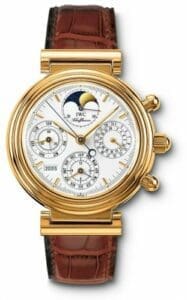 The Da Vinci Perpetual Calendar reference IW3750-01 has a polished Yellow Gold case and a White dial.IWC introduced its perpetual calendar mechanism for wristwatches in 1985 in the Da Vinci reference 3570. It was a spectacular novelty at the time. Critically acclaimed and powered by its price that shook the industry, the module would grow out to be the most widely sold perpetual calendar mechanism – not only fitted to the Da Vinci collection, but in adapted form in IWC watches such as the Novecento, the GST, the Pilot’s Chronograph and also various models by JLC, including the Master Ultra Thin Perpetual. It would also serve as the base for the IWC’s Grande Complication and their masterpiece of the time, the spectacular Destriero Scafusia.The Da Vinci Perpetual 3750 has a case of 39 * 14.3mm, with hinged lugs. It was available in various metals and with a choice of dial colors, each of which in turn was made with markings in German, Italian, English and French (not always properly reflected in our pictures). The first versions of the Da Vinci Perpetual Calendar used the caliber 7906(0) movement, which was updated to 79061 around 1988 and finally 79261 around 1995.Plexi glass was the default option, though at request the watch could be fitted with a sapphire crystal. From 1987 on it was available with a ceramic case in the form of the 3755 (with a sapphire crystal per default), whilst models with gem-set cases carry the reference 8153. A bracelet option was offered in the form of the reference 9252, or 9253 if the case was to be set with diamonds. Its successor, the 3758, was introduced in ca. 2005.