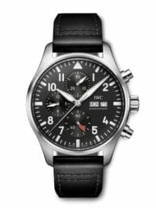 The IWC Pilot’s Watch Chronograph {WATCH_REF] was introduced in 2022. This watch has a stainless steel case of 43.00mm, which now houses a caliber 69385 – an ‘IWC manufactured’ chronograph movement with windows for both day and date. The dial is Black.