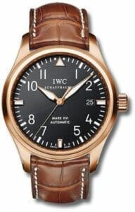 The IWC Pilot’s Watch reference IW3255-15 is a unique piece created in 2009. It features a rose gold case and a black dial.