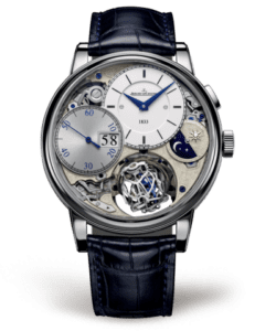 Astonishingly creative with its tourbillon appearing to defy the laws of gravity and its design toying with surfaces, the Master Grande Tradition Gyrotourbillon 3 Jubilee watch in ultra-white platinum pays a fine tribute to the inventiveness of Antoine LeCoultre, the Manufacture’s founder. This model is presented in a limited series of 75 pieces.Reference 5036420 has a silvered dial and is fitted a black leather strap