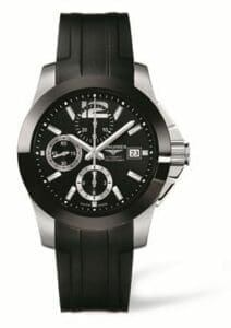 Longines Conquest is the quintessential expression of the brand’s sporting elegance. Special attention went into the aesthetics of the bezel, the cabochon crown and the links. The Longines Conquest includes technical features that meet the requirements of the most demanding sportsmen and women. Both sober and sophisticated, these models are guaranteed to catch the eye at the most fashionable soirées as well as in the stands of prestigious horse races.Ref. L3.661.4.56.2 has a black ceramic bezel and a matching rubber strap.