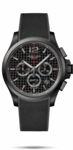 The Longines Conquest V.H.P. Chronograph 44 has a PVD coated stainless steel case in 44mm. This watch with carbon black dial features hours, minutes, seconds, a chronograph and a date indicator at 4 o’clock. The watch is powered by a very high precision (V.H.P.) quartz movement with E.O.L. indicator. It comes on a rubber strap with folding clasp