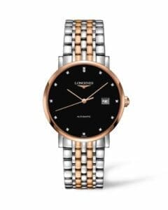 The Longines Elegant collection houses a series of watches with timeless, elegant looks. Reference L4.910.5.57.7 has a case with a diameter of 39.00. Displayed here with caliber L888.3, it can house either an L619 or L888 (.2 or .3) depending on the year of production. The dial is Black. Both case and bracelet are partially capped in red gold.