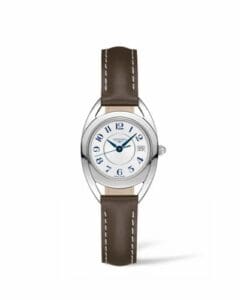 The Longines Equestrian collection consists of elegant ladies watches with looks that are inspired by the world of equestrian sports.The present watch has a case design inspired specifically by horseshoes. The case measures 26mm across, housing the caliber L152. Reference L6.136.4.73.2 has a white dial with Arabic numerals.