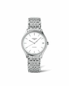 The Longines Lyre reference L4.361.4.12.6 has a stainless steel case of 30.00mm. It is powered by a self-winding movement with central seconds and date (caliber L888.5). The dial is White.