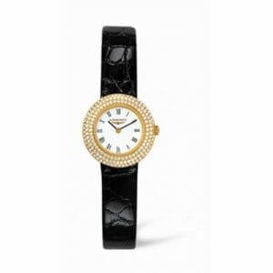 The Prestige Gold collection is a series of watches exclusively available in 18k gold. The present model has a round case of 22.5 mm in gold , with its bezel set with a triple row of diamonds.