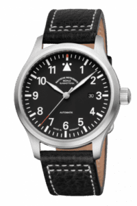The Terrasport I takes on the role of the observation watch in Mühles’ collection of pilots‘ watches. With its impressive diameter of 44 millimetres, this model‘s brushed stainless steel case provides room for a large face and correspondingly expansive minute graduation in which the position of the red second hand can be read in increments of one second. Reference M1-37-34-MB has a black dial and is fitted with a brown leather strap
