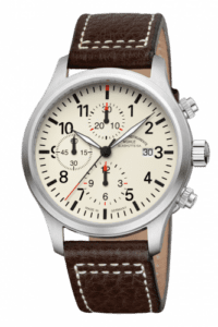 At the height of their development, these time measuring instruments were precisely designed to meet their intended purpose of use. Pilots were equipped with one of a variety of chronograph models, a large observation watch was available for navigation officers and other crew members wore smaller three-hand watches. With its typical Mühle straightforwardness, precision and reliability, the Terrasport I Chronograph adds a new chapter to the history of the pilots‘ chronographReference M1-37-77-LB has a cream dial and is fitted a brown leather strap