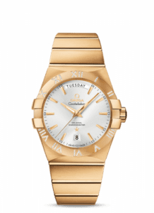 The ref. 123.55.38.22.02.002 Constellation has a yellow gold case and matching bracelet. Its iconic Roman numerals are inlaid with diamonds.