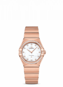 This new Omega Constellation Manhattan was released late 2018. Its 18K Sedna gold satin finished case is 28mm in diameter. The mother-of-pearl dial with diamond markers displays the hours and minutes. This Constellation Manhattan is powered by a quartz movement and it comes on a satin/polished bracelet in 18K Sedna gold.
