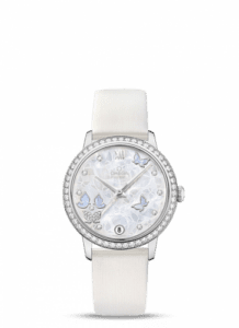 The Omega DeVille Prestige Co-Axial 424.57.33.20.55.001 features a white gold case with diamond-set bezel, and an enchanting white mother-of-pearl dial with a decorative butterfly design and nine diamond indexes in 18K white gold holders.