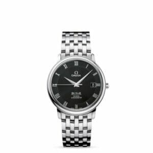 Reference 4574.50.00The OMEGA De Ville Prestige collection has attracted a large and loyal following with its classic, elegant design. These timepieces are characterised by pure styling with luxury finishes, and exude a timeless design. This model features an impressive two-zone black dial with Roman numeral hour indexes. The striking dial, with its date window at the 3 o’clock position, is protected by a scratch-resistant sapphire crystal. The bezel is mounted on a 36.5 mm stainless steel case, and is presented on a stainless steel bracelet. At the heart of this timepiece is the Co-Axial calibre 2500.